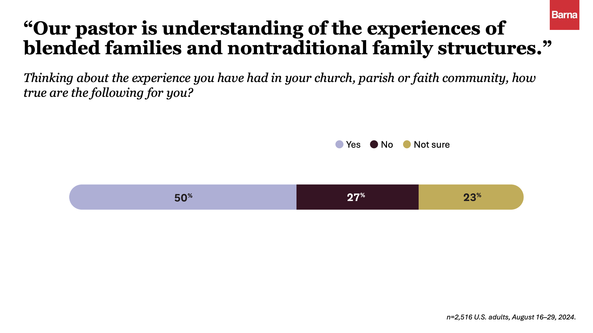 These realities suggest that pastors have both a deep personal investment in marriage and firsthand experience with its challenges. While this may uniquely position them to guide congregants through the complexities of love, loss, commitment and restoration, Barna data drawn from The State of Today’s Family suggests that U.S. churchgoers are split on whether their pastors are mindful of non-nuclear households.