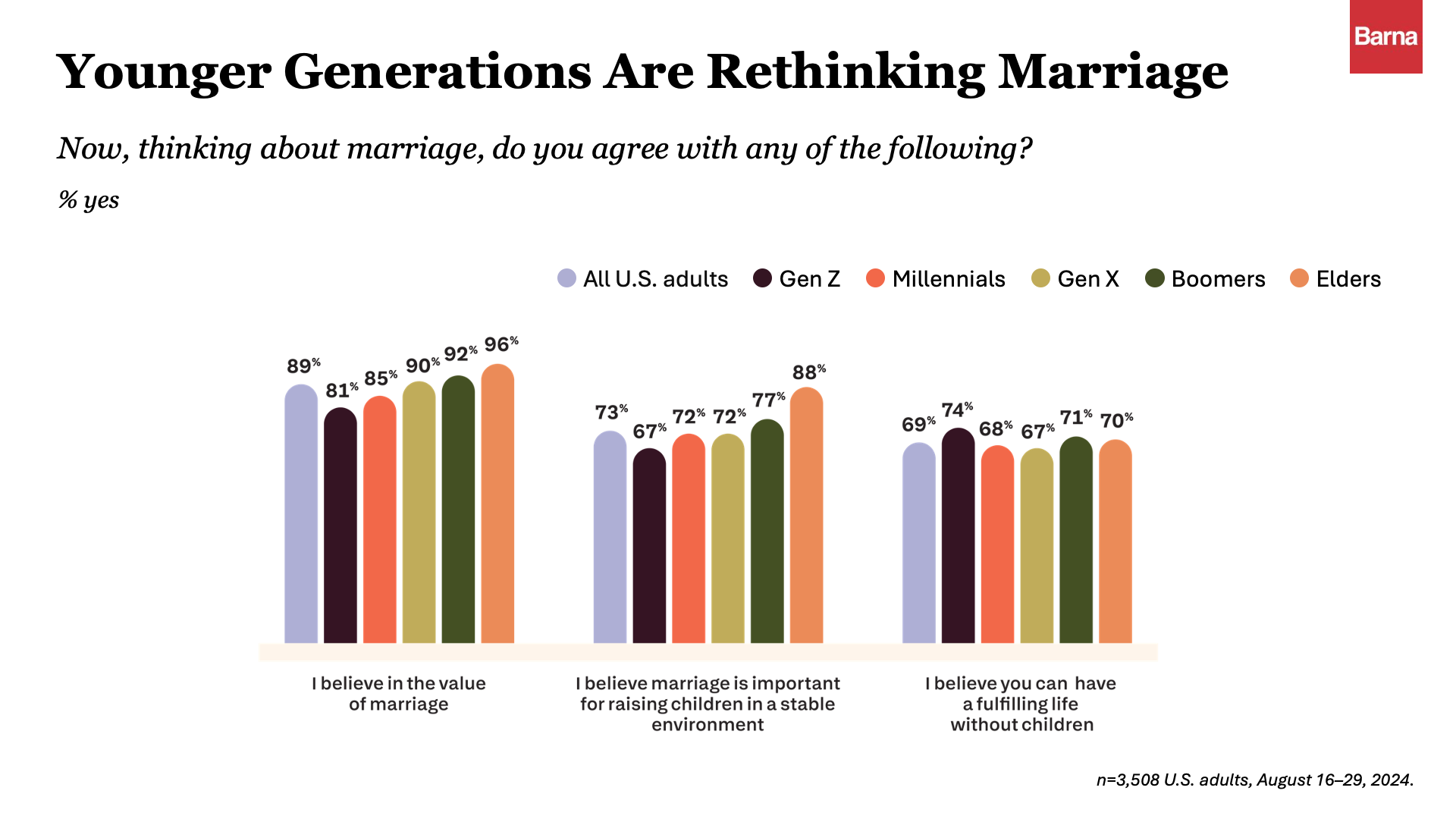 - Gen Z value marriage but are rethinking family. Most (81%) still believe in marriage and hope to wed someday, yet they’re rethinking what family and commitment look like in modern life.