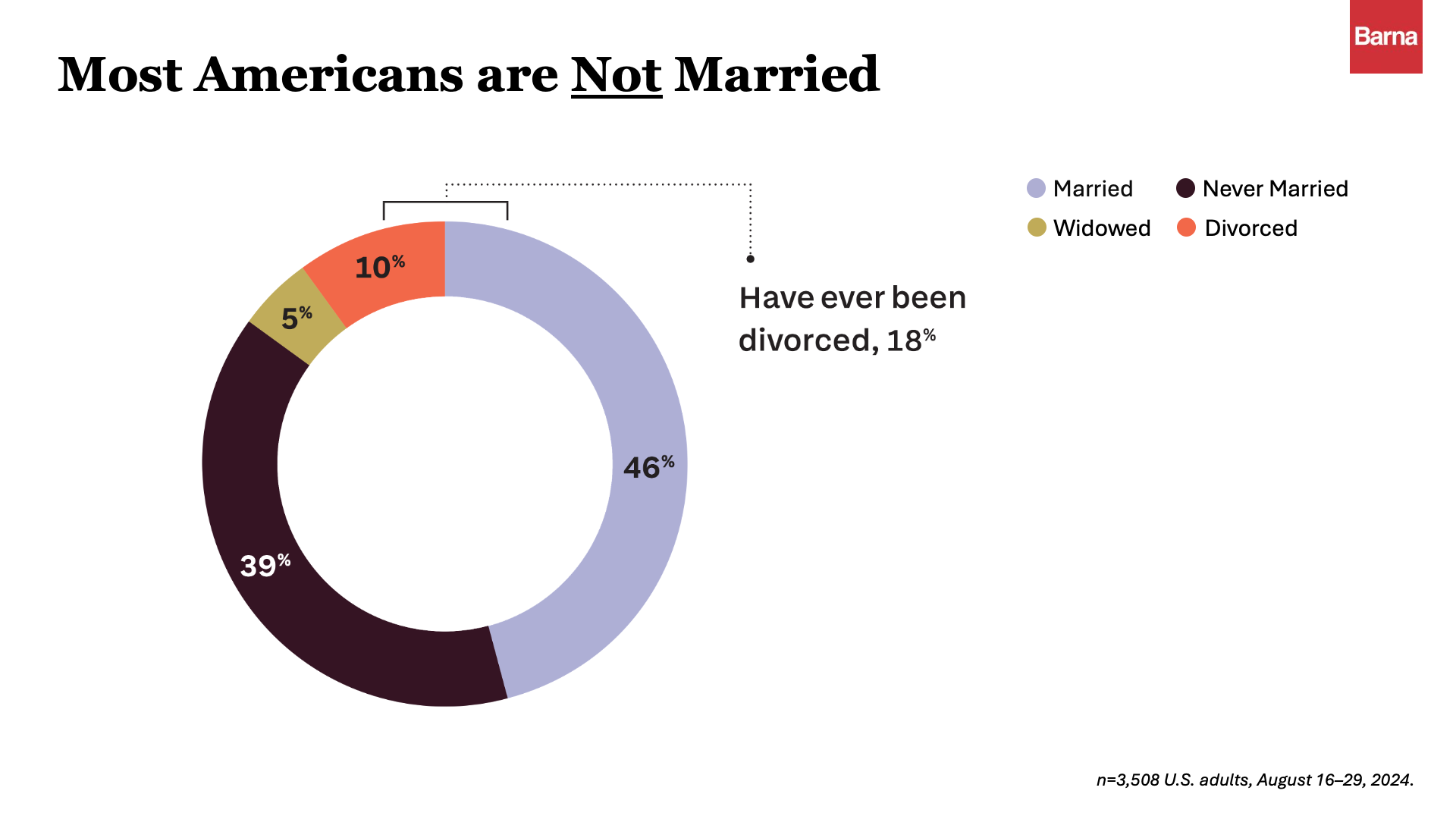 Eighteen percent of U.S. adults tell Barna they have been divorced at some point. While never-married adults are slow to choose marriage for the first time, divorced adults seem eager to return to it: More than half (55%) have remarried.
